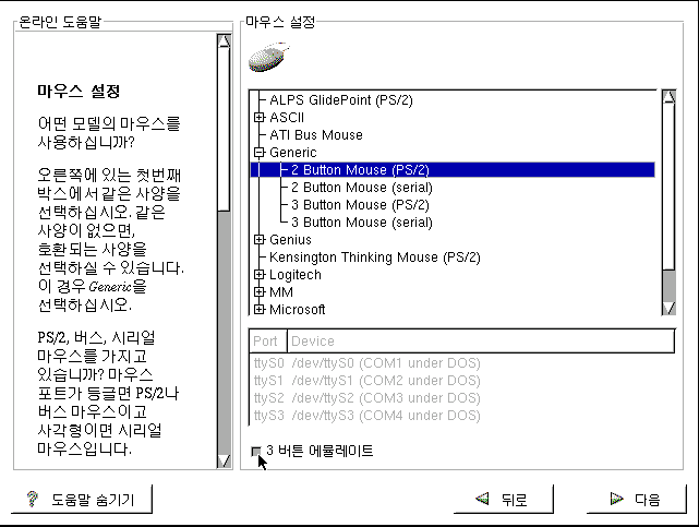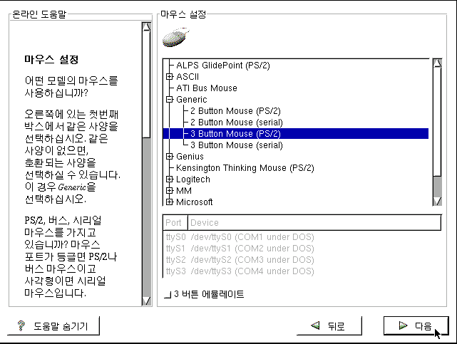 Á¾·ù¸¦ ¼±ÅÃÇϰí (´ÙÀ½)À» Ŭ¸¯ÇÕ´Ï´Ù. ¸¶¿ì½ºÀÇ Ä¿³ØÅͰ¡ µÕ±Û¸é PS/2,