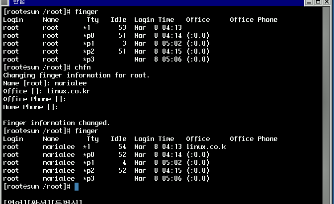 Ãâ·ÂÇÑ´Ù. º¯°æÇÒ ¶§´Â chfn(change finger name)À» »ç¿ëÇÏ¸é µÈ´Ù.